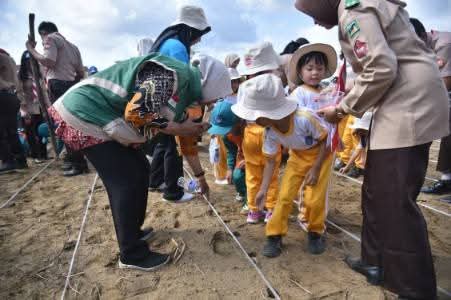 Wali Kota Maulana dan Bunda PAUD Kota Jambi melakukan penanaman jagung didampingi ratusan anak yang tampak ceria dengan tampilan atribut sekolah masing masing.