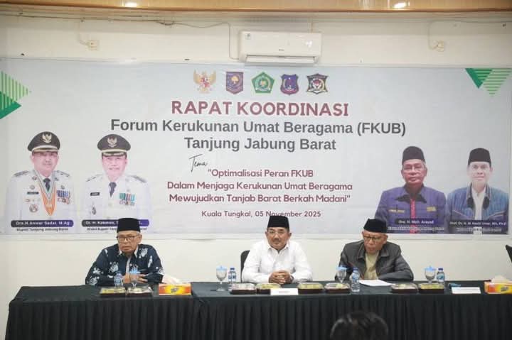 Rakor FKUB tahun ini mengusung tema “Optimalisasi Peran FKUB dalam Menjaga Kerukunan Umat Beragama Mewujudkan Tanjab Barat BERKAH Madani.”