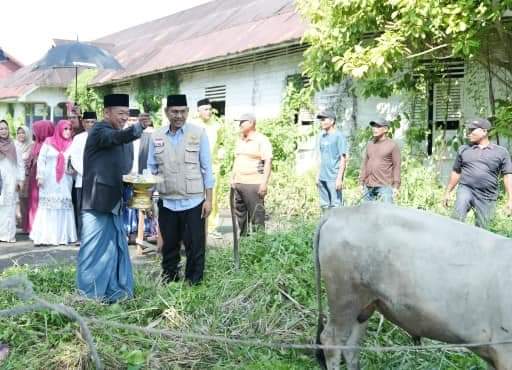 “Untuk disini kita menyembelih dua ekor sapi yang kami sediakan dari keluarga besar saya dan istri. Jadi ada 200 paket sembako dari Baznas dan 200 paket daging qurban dari kami,” jelasnya.