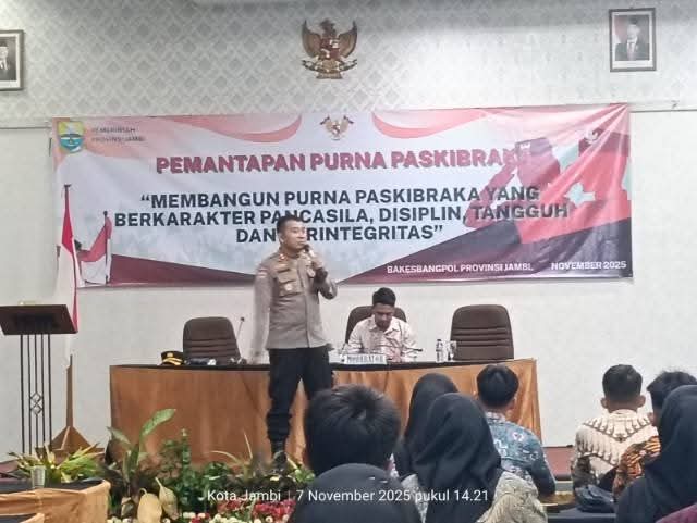 Ungkap.co.id – Ditbinmas Polda Jambi terus memperluas model pembinaan masyarakat berbasis kolaboratif. Terbaru, Pemprov Jambi bersama Badan Kesatuan Bangsa dan Politik (Kesbangpol) menggelar penambahan dan pembekalan wawasan kebangsaan (Wasbang) bagi Purna Paskibraka Provinsi Jambi tahun anggaran 2025, yang dilaksanakan pada Jumat (7/11/2025) di Shang Ratu Hotel, Jambi.