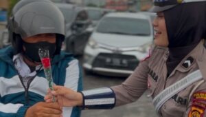Satlantas Polresta Jambi Bagikan Bunga dan Coklat ke Pengendara di Hari Guru