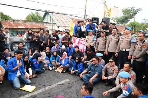 Menanggapi hal tersebut, Wakapolda Jambi bersama jajaran PJU turun langsung dan duduk bersama pendemo di jalan untuk berdialog dengan massa aksi.