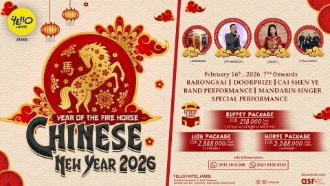 Ungkap.co.id – Dalam rangka menyambut Tahun Baru Imlek 2577, Yello Hotel Jambi menghadirkan perayaan spesial Chinese New Year 2026 dengan tema “Year of The Fire Horse” yang akan diselenggarakan pada Senin, 16 Februari 2026, mulai pukul 19.00 WIB hingga selesai.